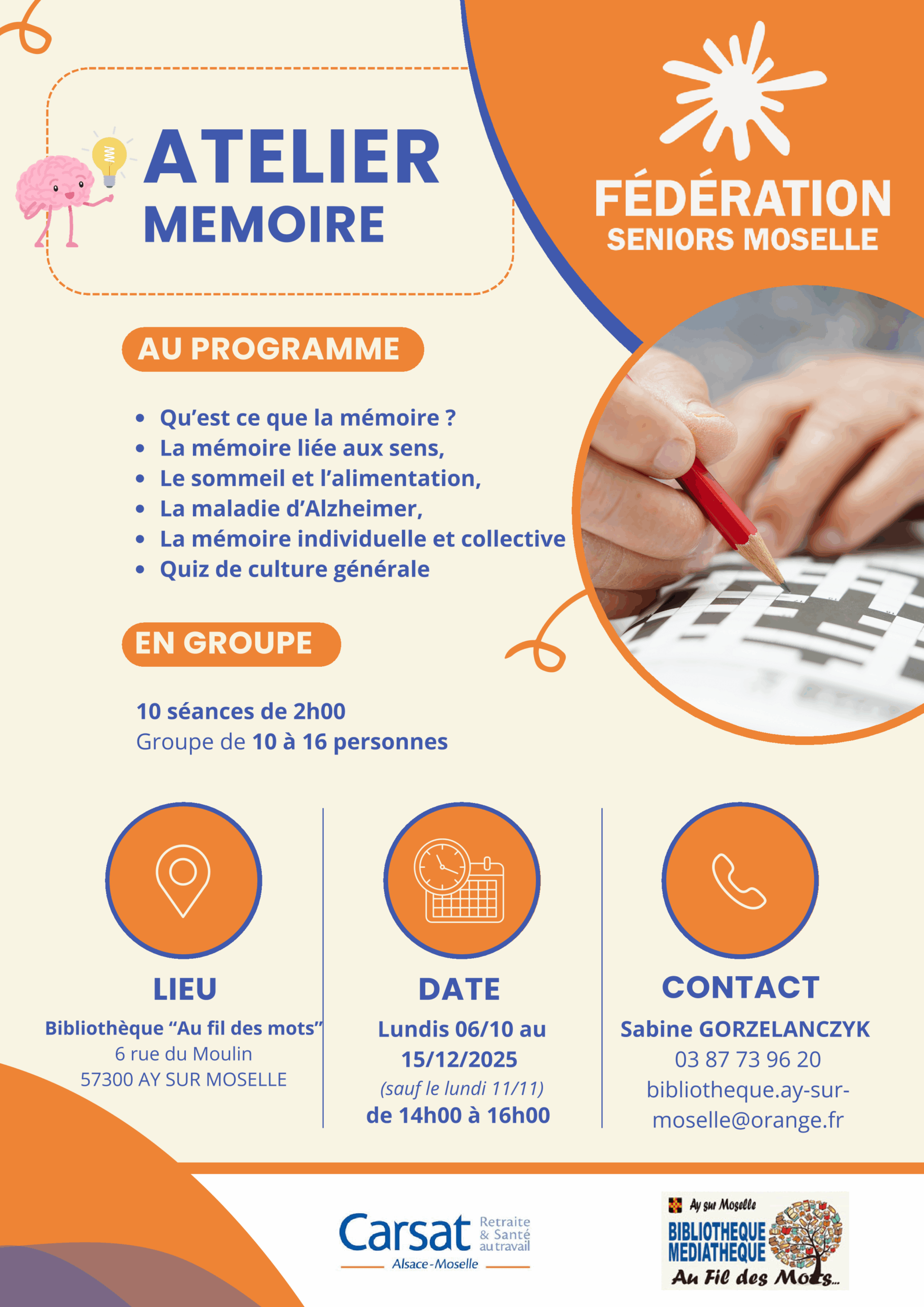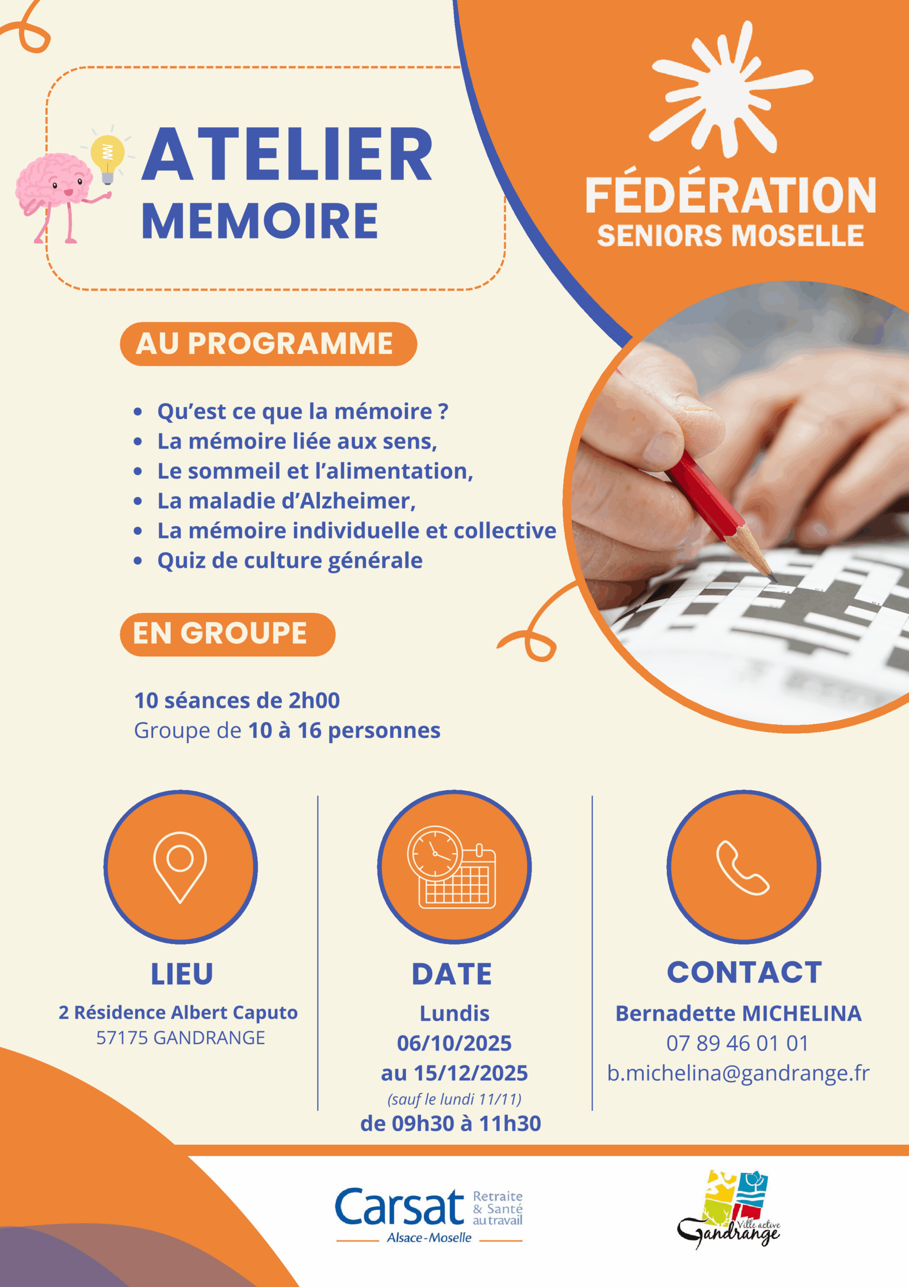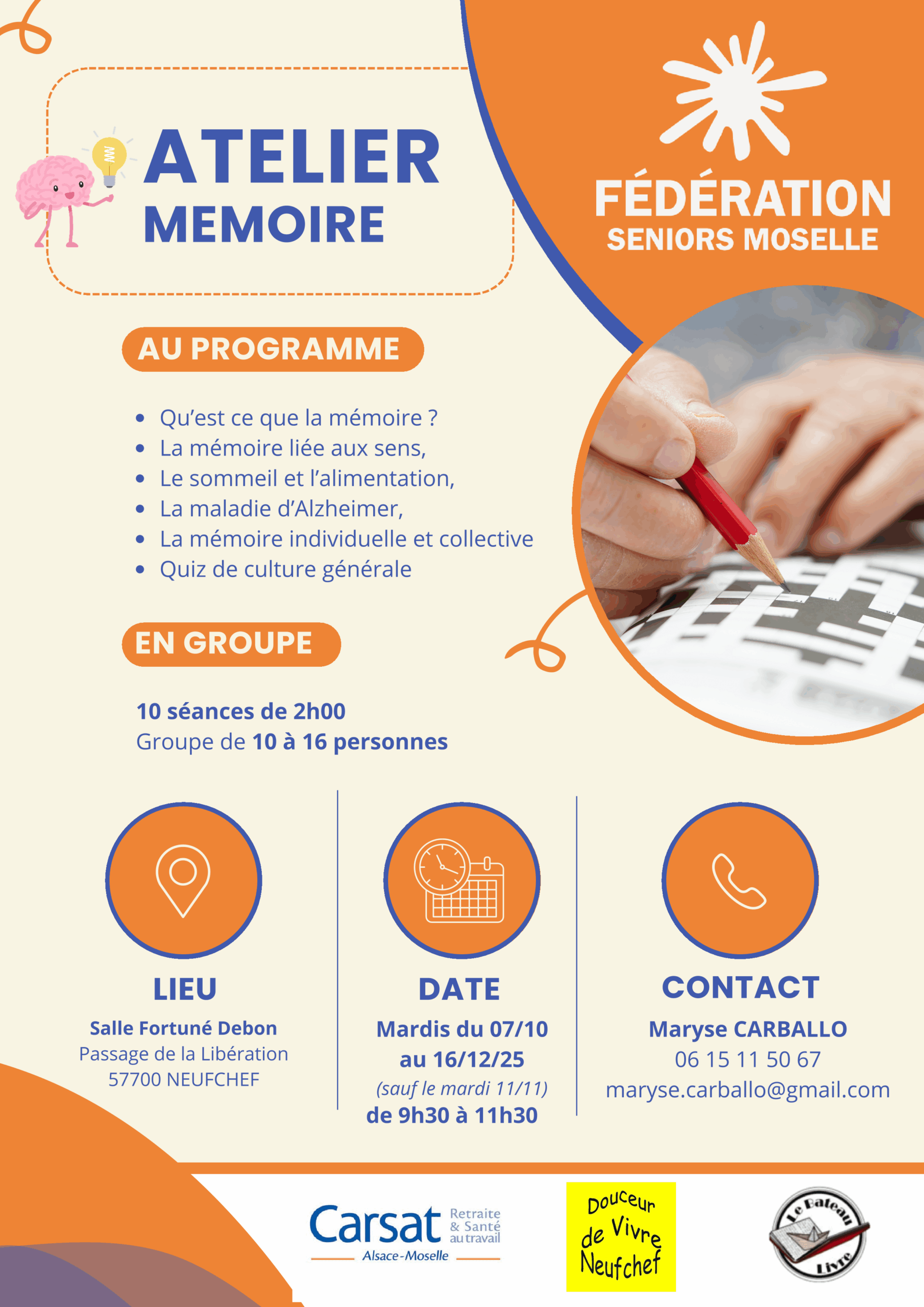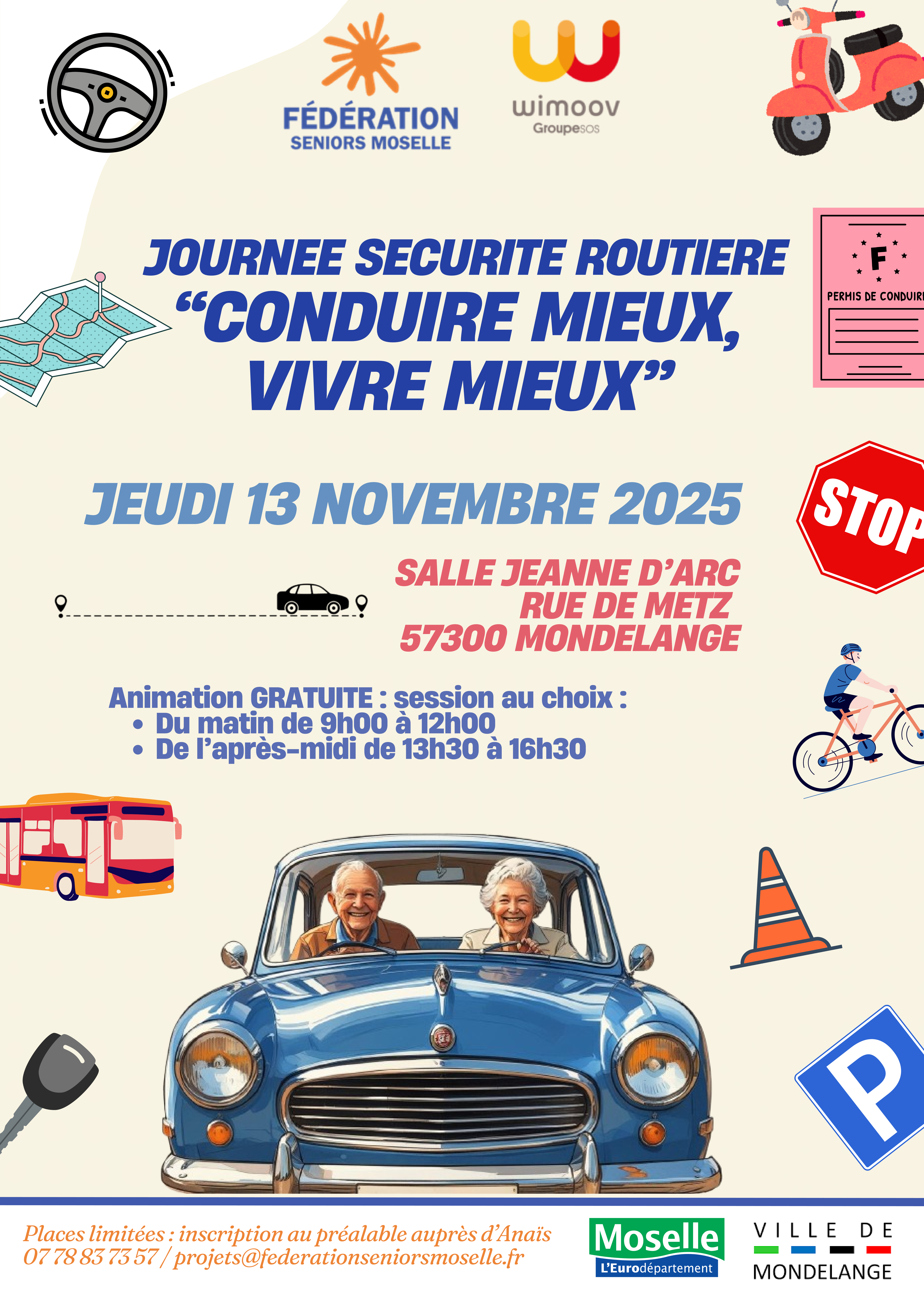 Participez à notre atelier « Conduire Mieux, Vivre Mieux », le 13 novembre à la salle Jeanne d’Arc de Mondelange . Inscriptions au 07 78 83 73 57 ou par mail à : projets@federationseniorsmoselle.fr