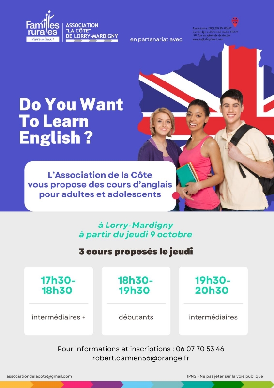 Cours d’anglais tous les niveaux, pour adultes et adolescents., dés le 9 octobre 2025, les jeudis soirs. Horaires et renseignements sur l’affiche ci-contre.