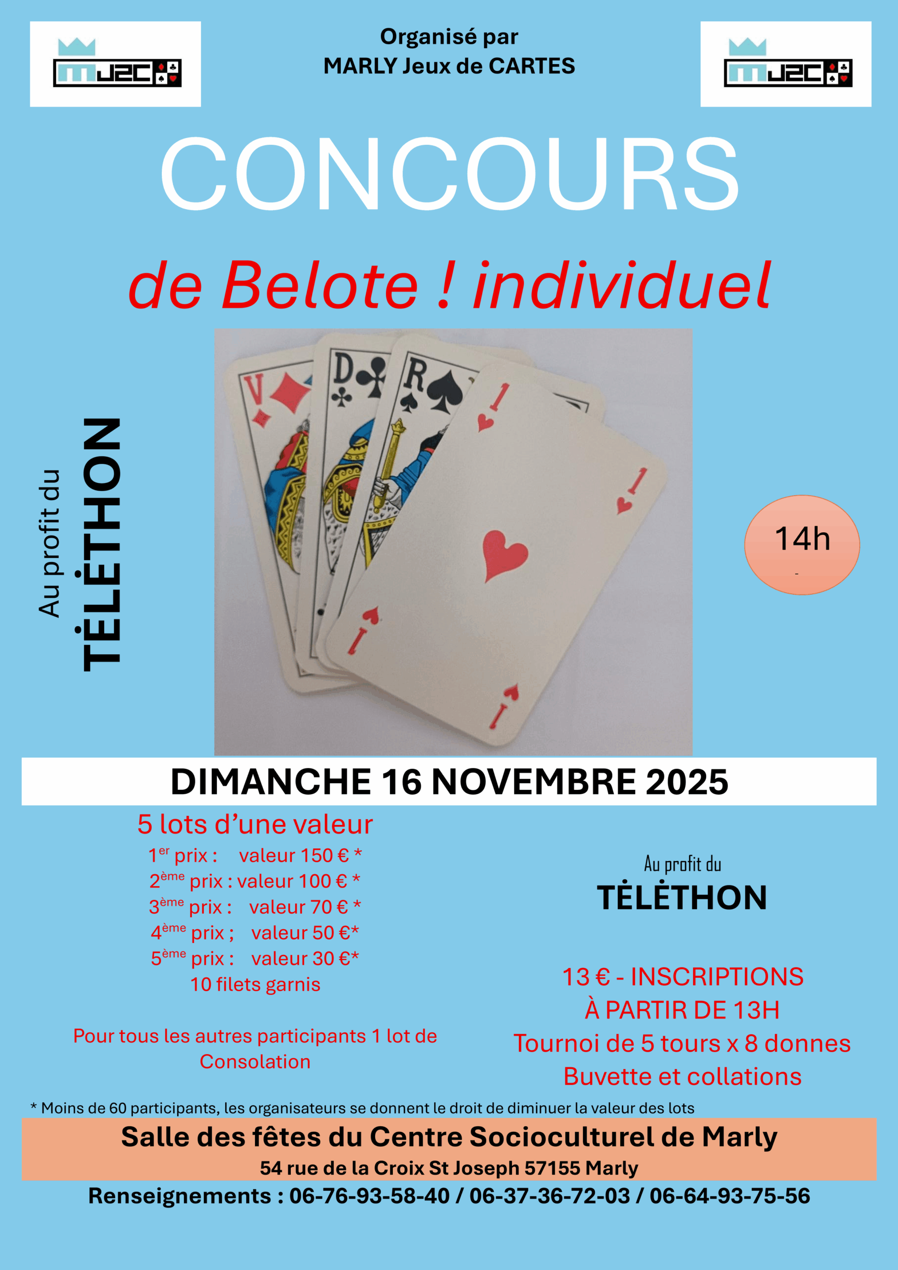 L’Association Marly Jeux de Cartes organise 2 journées de concours au profit du Téléthon à la Salle des Fêtes du Centre Socio Culturel de Marly.