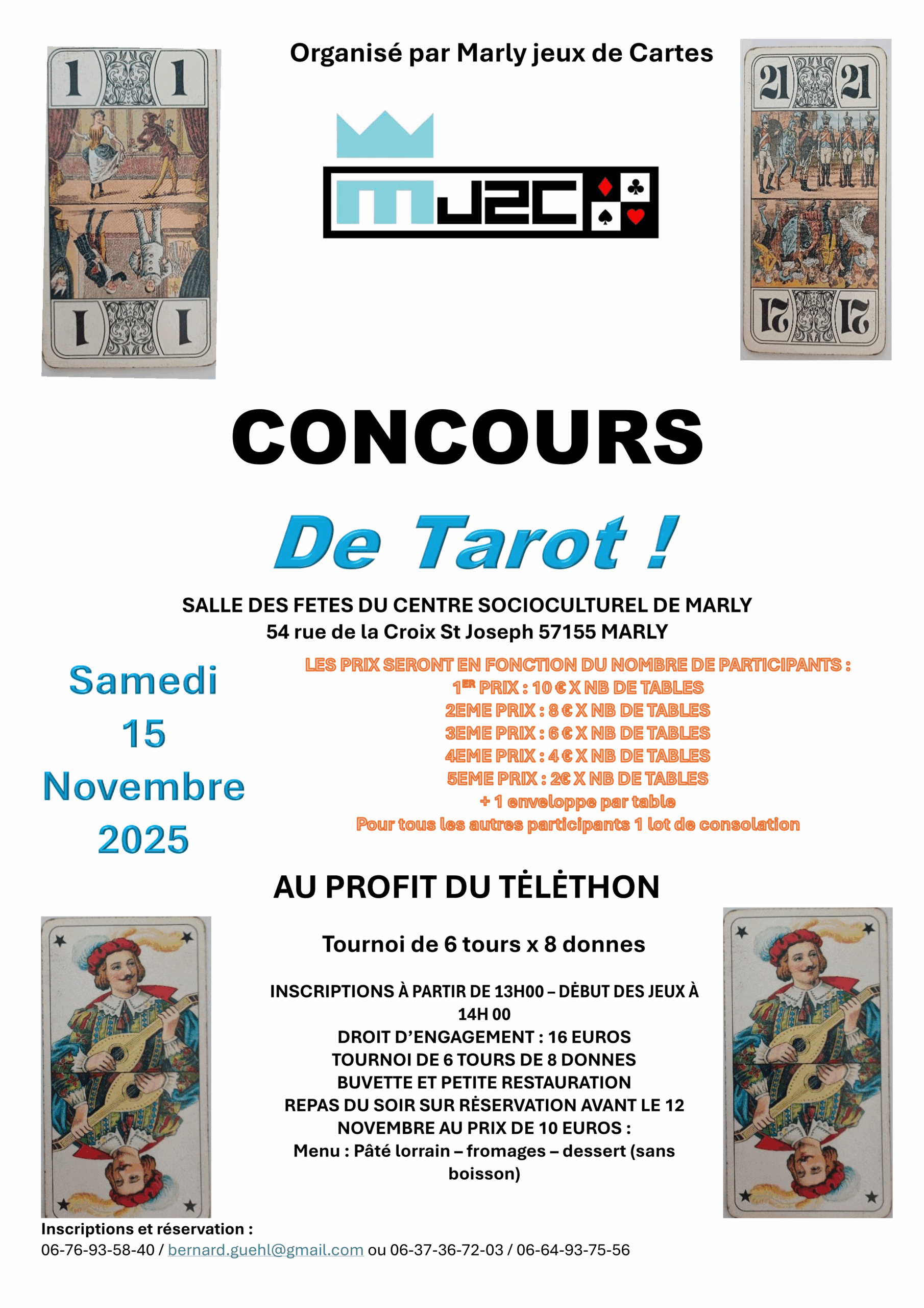 Le samedi 15 novembre 2025, concours de tarot. Buvette et restauration sur place. Inscriptions à partir de 13h00.