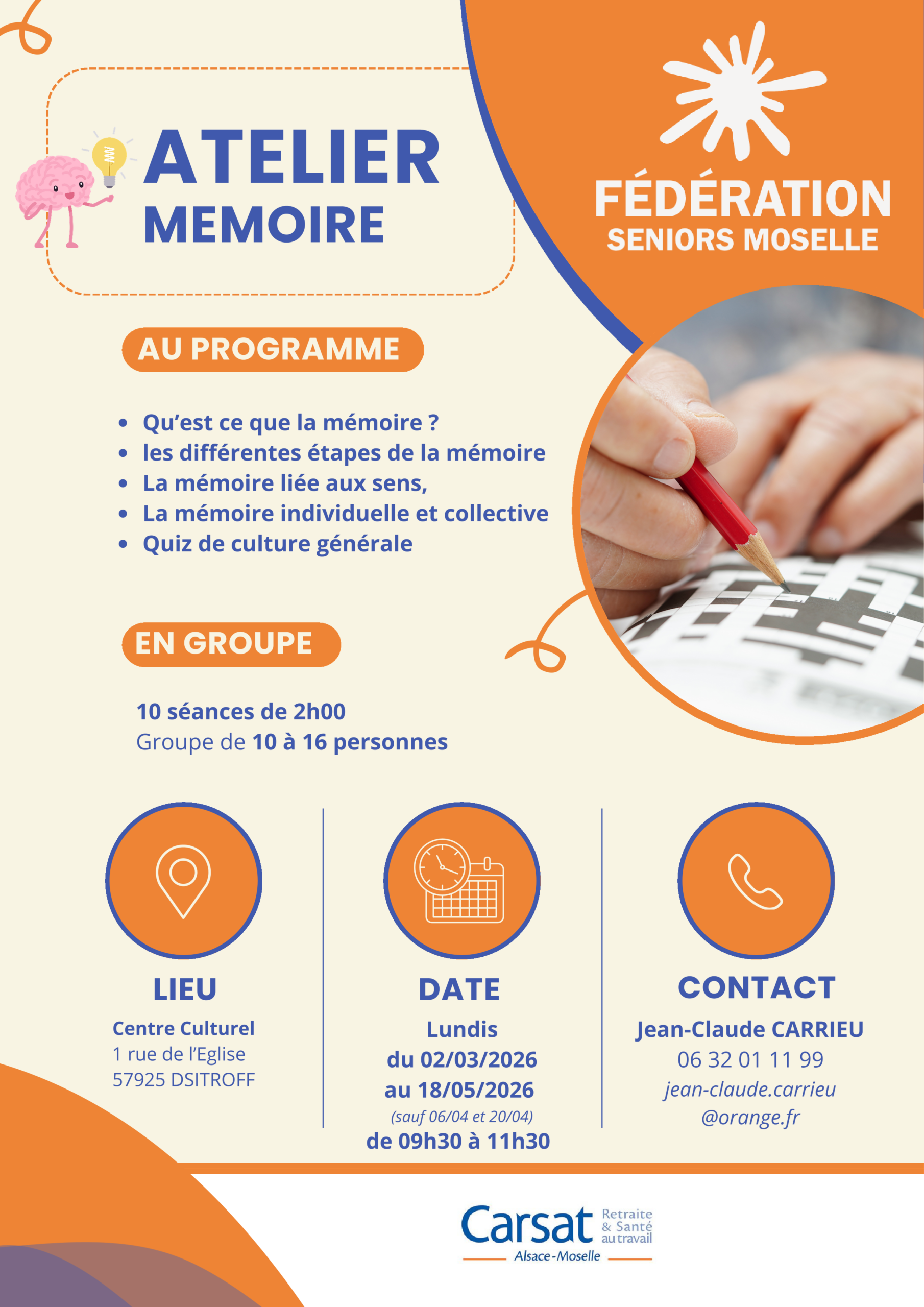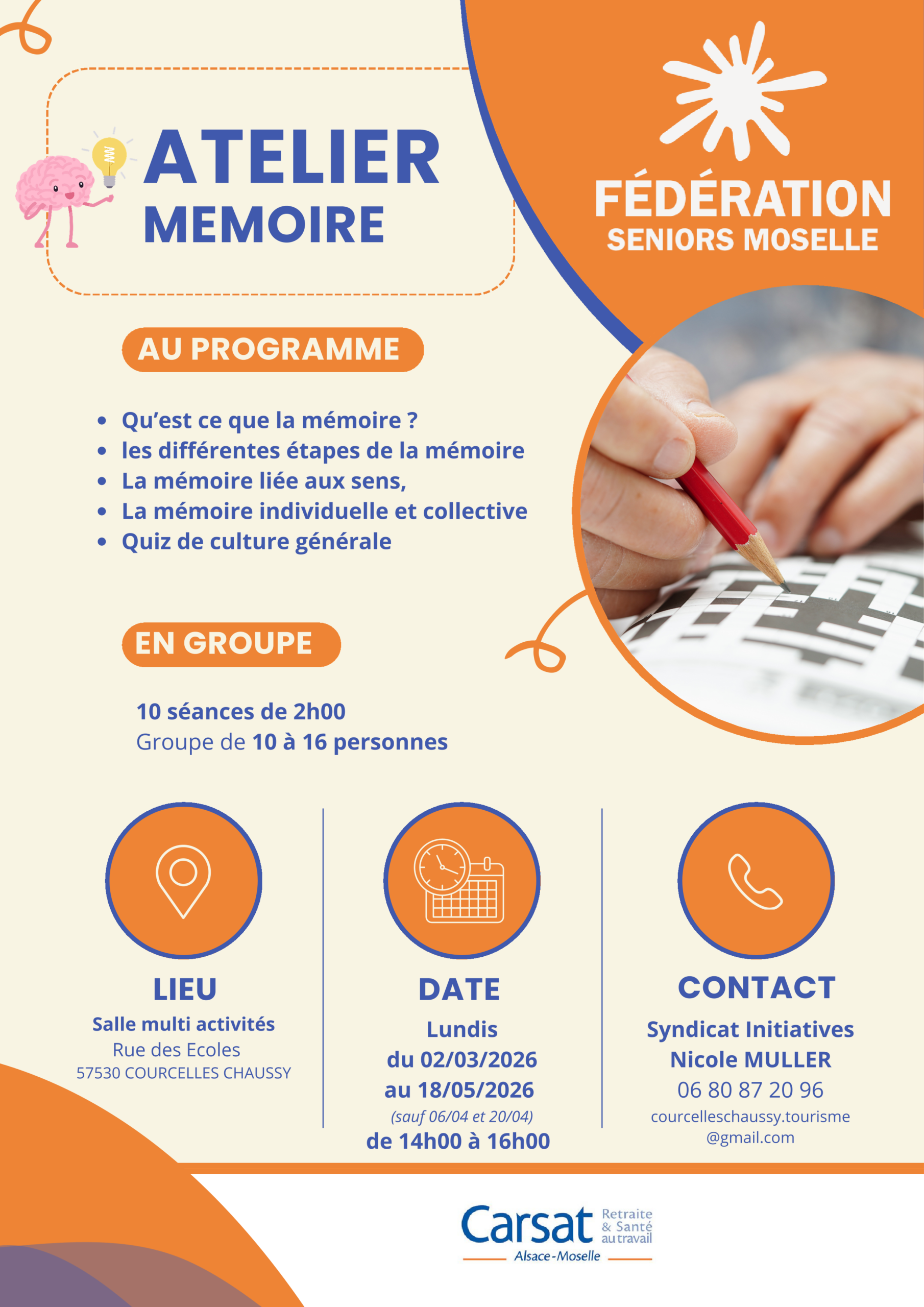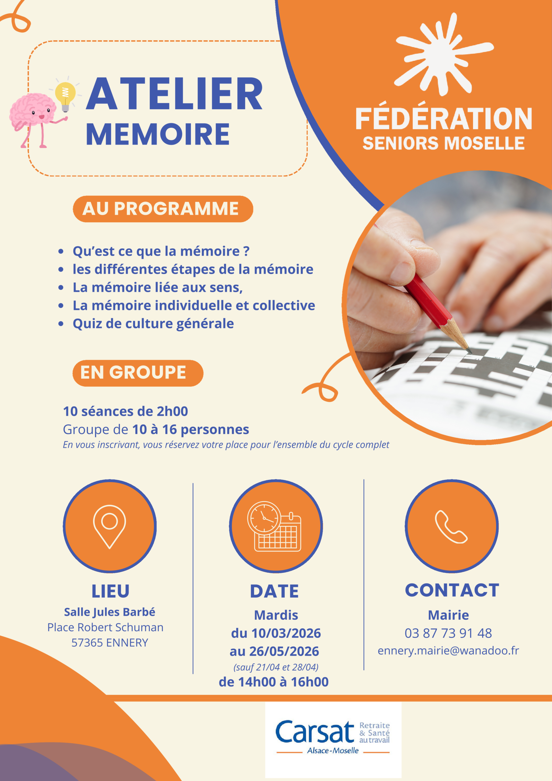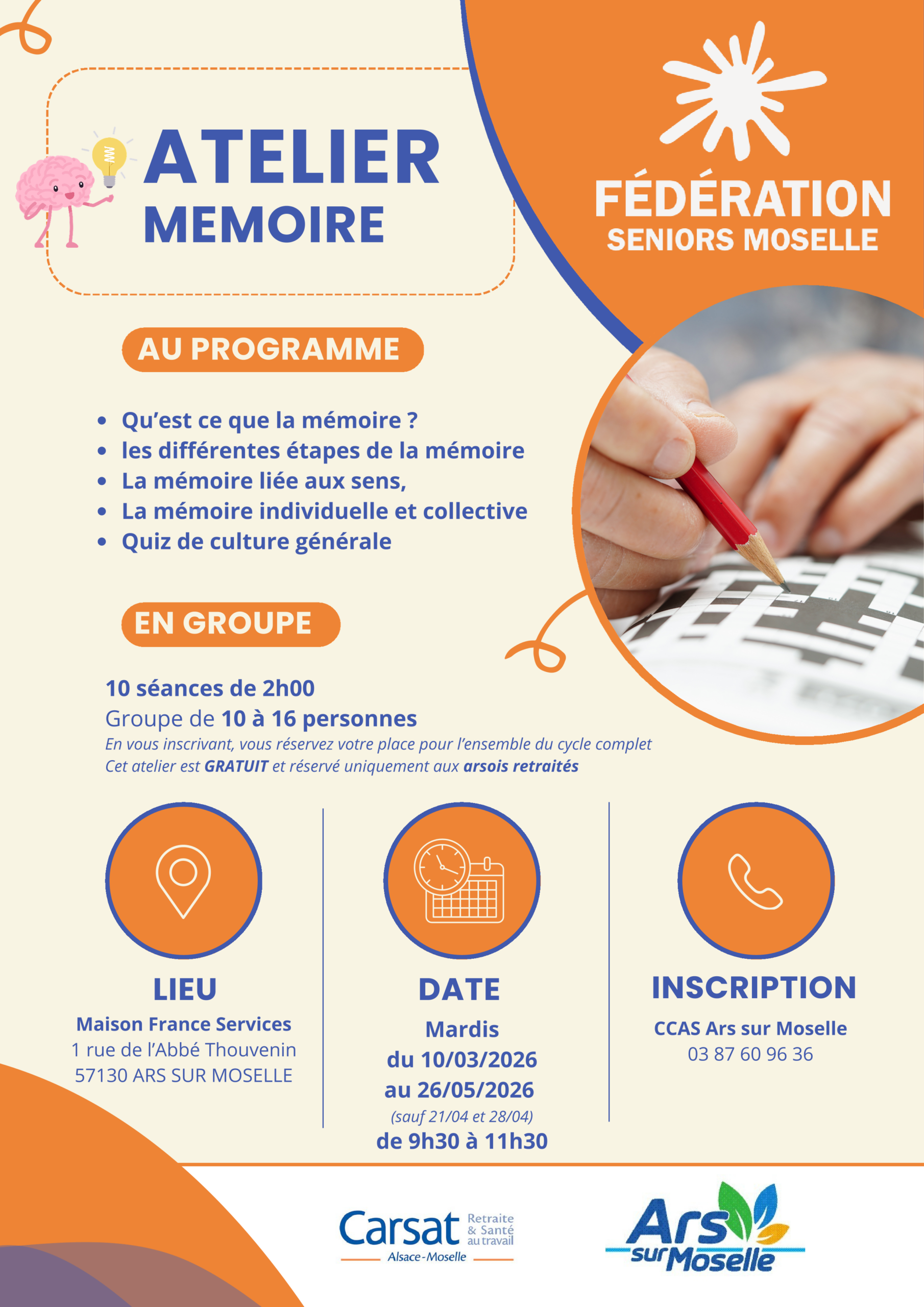 Les ateliers Mémoire du premier semestre 2026 sont programmés : Retrouvez-nous à Ars Sur Moselle, Courcelles -Chaussy, Distroff et Ennery dès le mois de Mars. Renseignements à retrouver sur les flyers ci-contre.