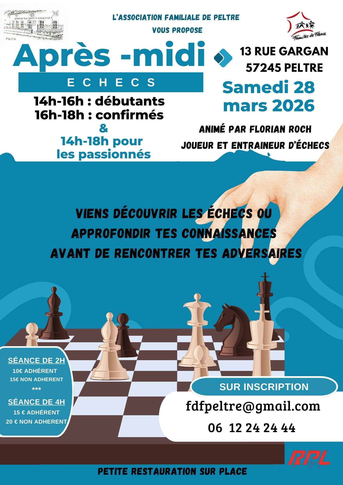 Aprés-midi Echecs avec l’Association Familiale de Peltre : le 28 mars de 14h00 à 18h00. Inscrivez-vous par mail à : fdfpeltre@gamil.com ou au 06 12 24 24 44