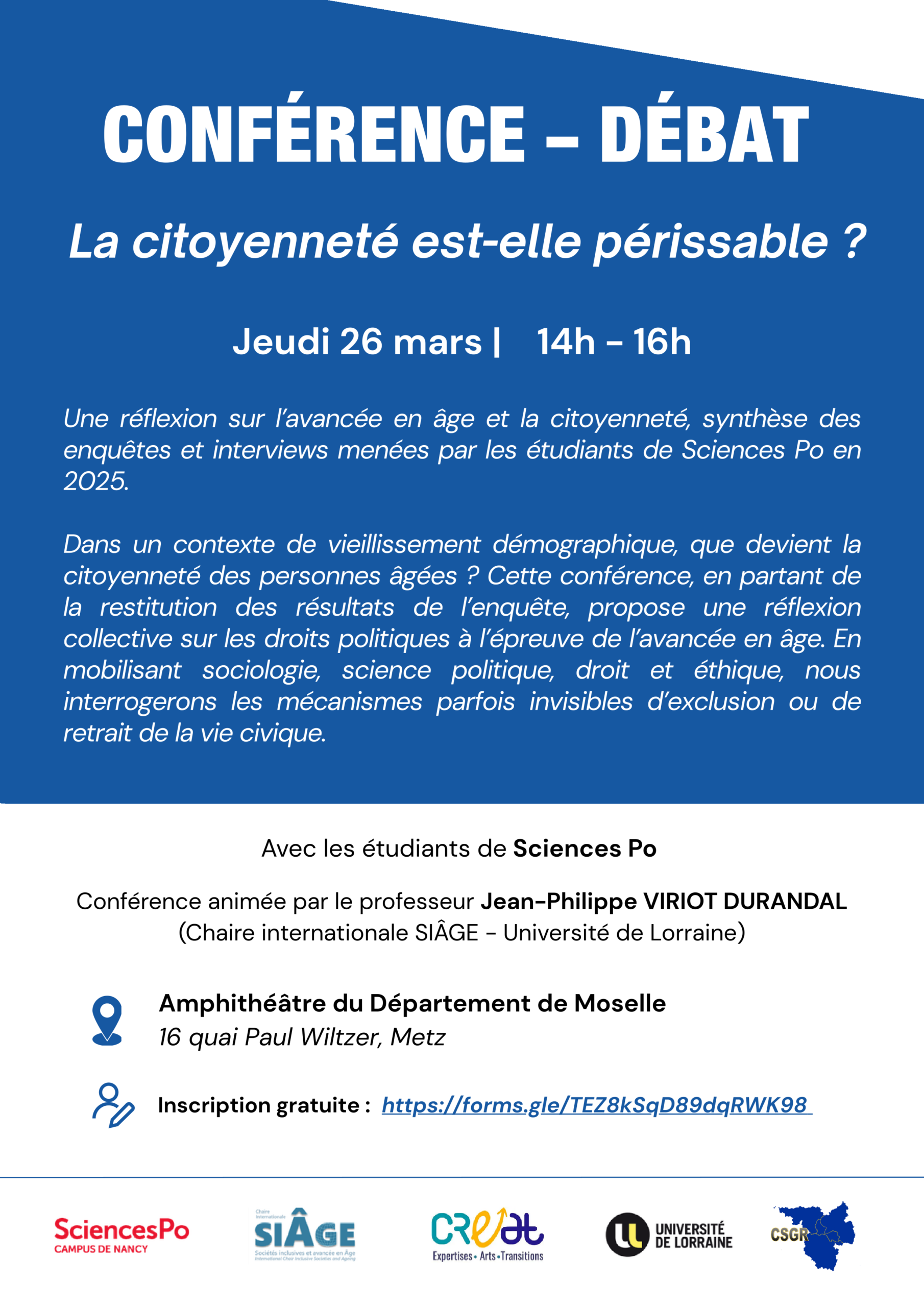 Conférence Débat sur la citoyenneté des seniors le Jeudi 26 mars, animé par le professeur Viriot-Durandal (Chaire Siage), avec les étudiants de Sciences Po. A l’amphithéâtre du Département de la Moselle. Inscriptions : https://forms.gle/TEZ8kSqD89dqRWK98