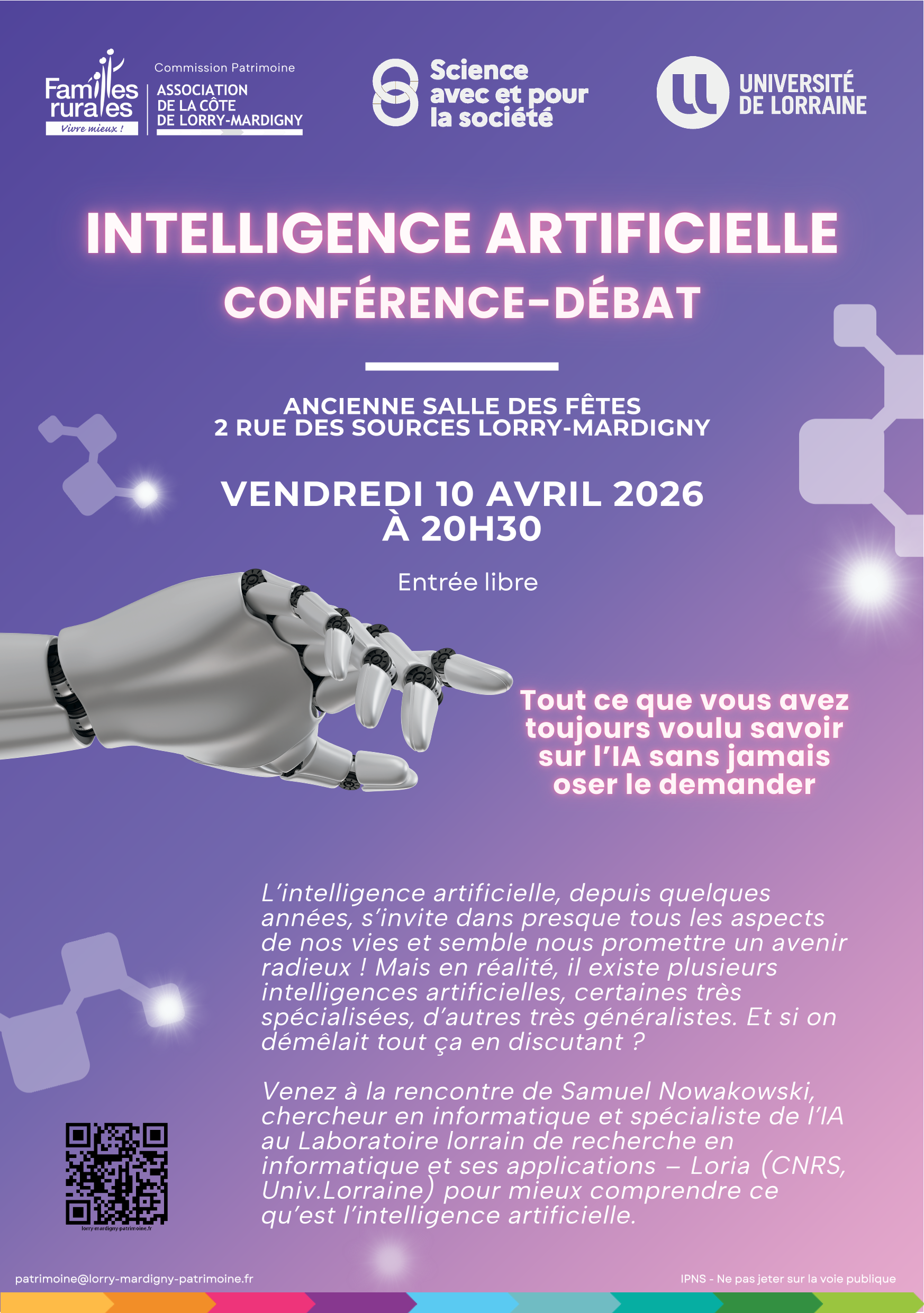 L’Association Familiale de la Côte de Lorry Mardigny vous invite à un débat sur l’Intelligence Artificielle, animé par Samuel Nowakowski, maître de conférences à l’Université de Lorraine. Entrée libre, le vendredi 10 avril, à 20h30 à l’ancienne salle des fêtes de Lorry Mardigny