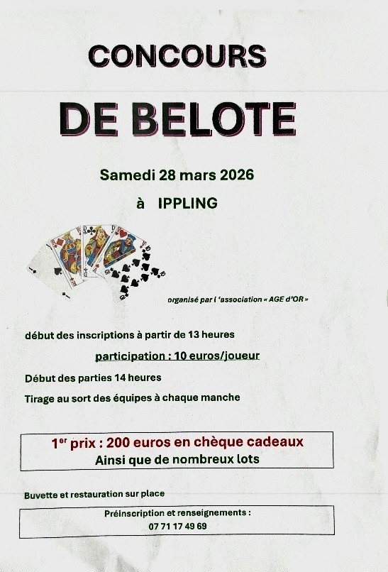 L’Association l’Age d’Or d’Ippling organise un concours de belote le samedi 28 mars à partir de 13h00. Inscriptions au 07 71 17 49 69