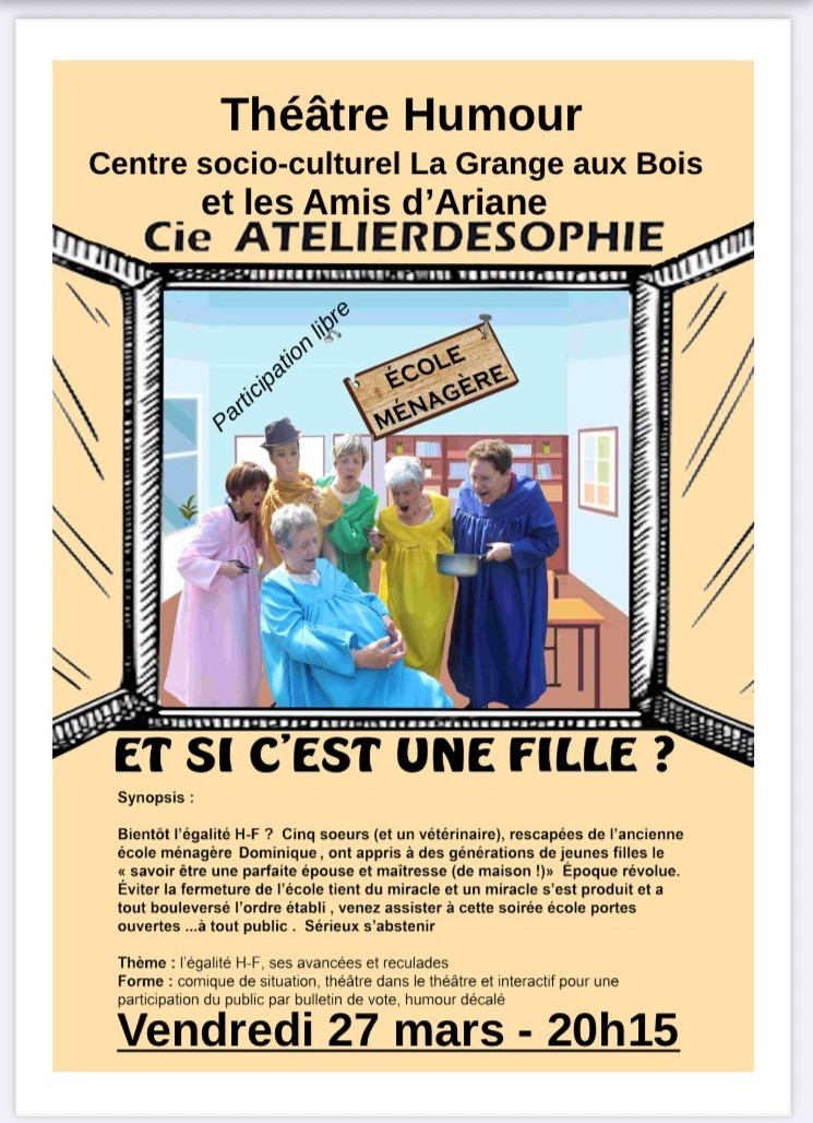 Le Centre socio-culturel de la Grange aux Bois et le Club Les Amis d’Ariane vous invitent à découvrir la pièce « Et si c’est une fille ? », Mercredi 27 mars, à 20h15, au Centre Socio Culturel de la Grange Aux Bois, Metz. Participation Libre Venez rire et partager un bon moment avec cette pièce de la compagnie Atelier de sophie, sur le thème de l’égalité homme-femme, ses avancées… et ses reculades. Une pièce de théâtre interactif, où le public est invité à participer. Un moment drôle, où chacun aura son mot à dire !