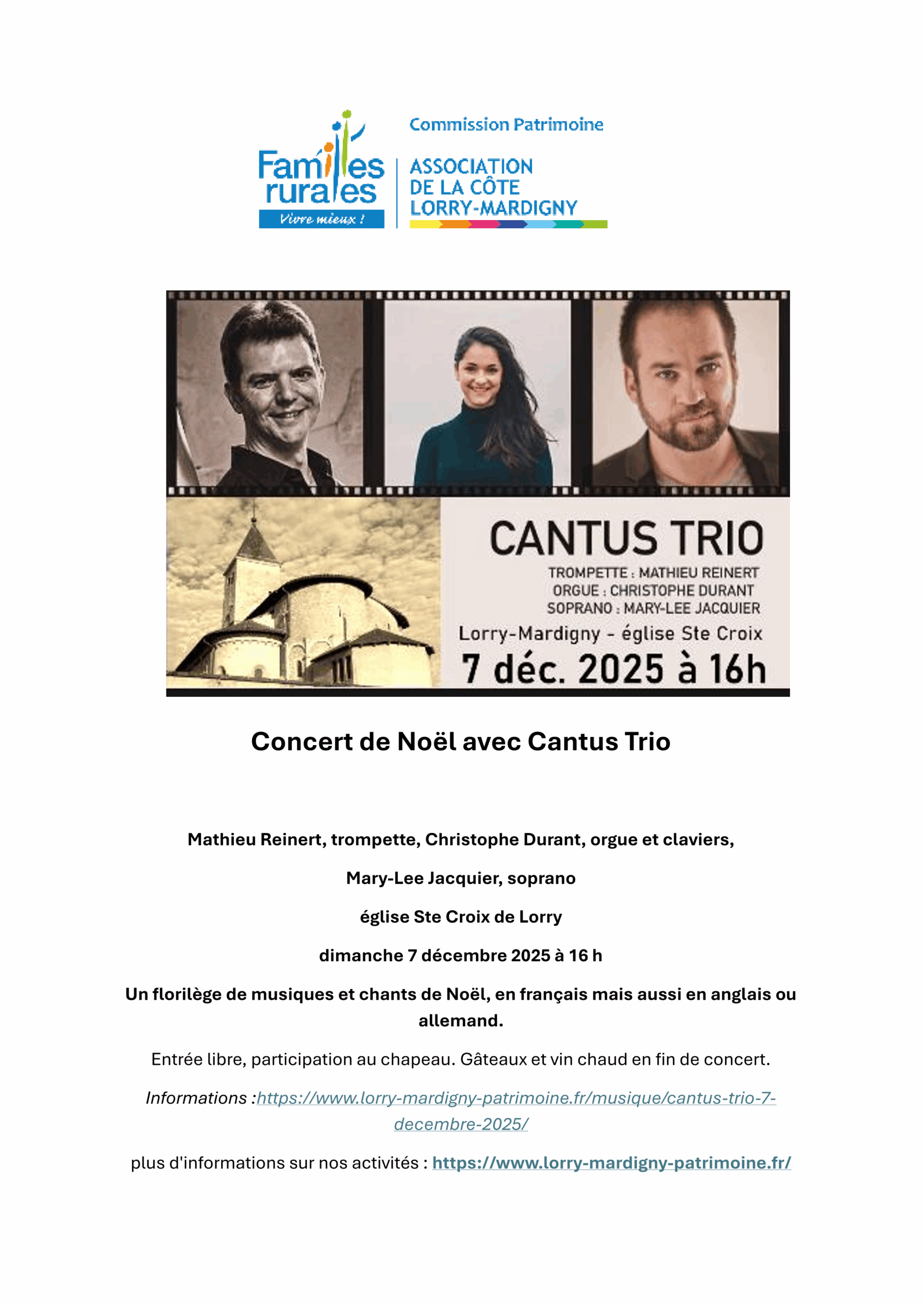 Le dimanche 7 décembre à 16h00, à l'Eglise Sainte Croix de Lorry Mardigny, rendez-vous pour un florilège de musiques et chants de Noël, en français mais aussi en anglais ou allemand. Entrée libre. Gâteaux et vin chaud en fin de concert. Pour plus d'informations : https://www.lorry-mardigny-patrimoine.fr/musique/cantus-trio-7-decembre-2025/
