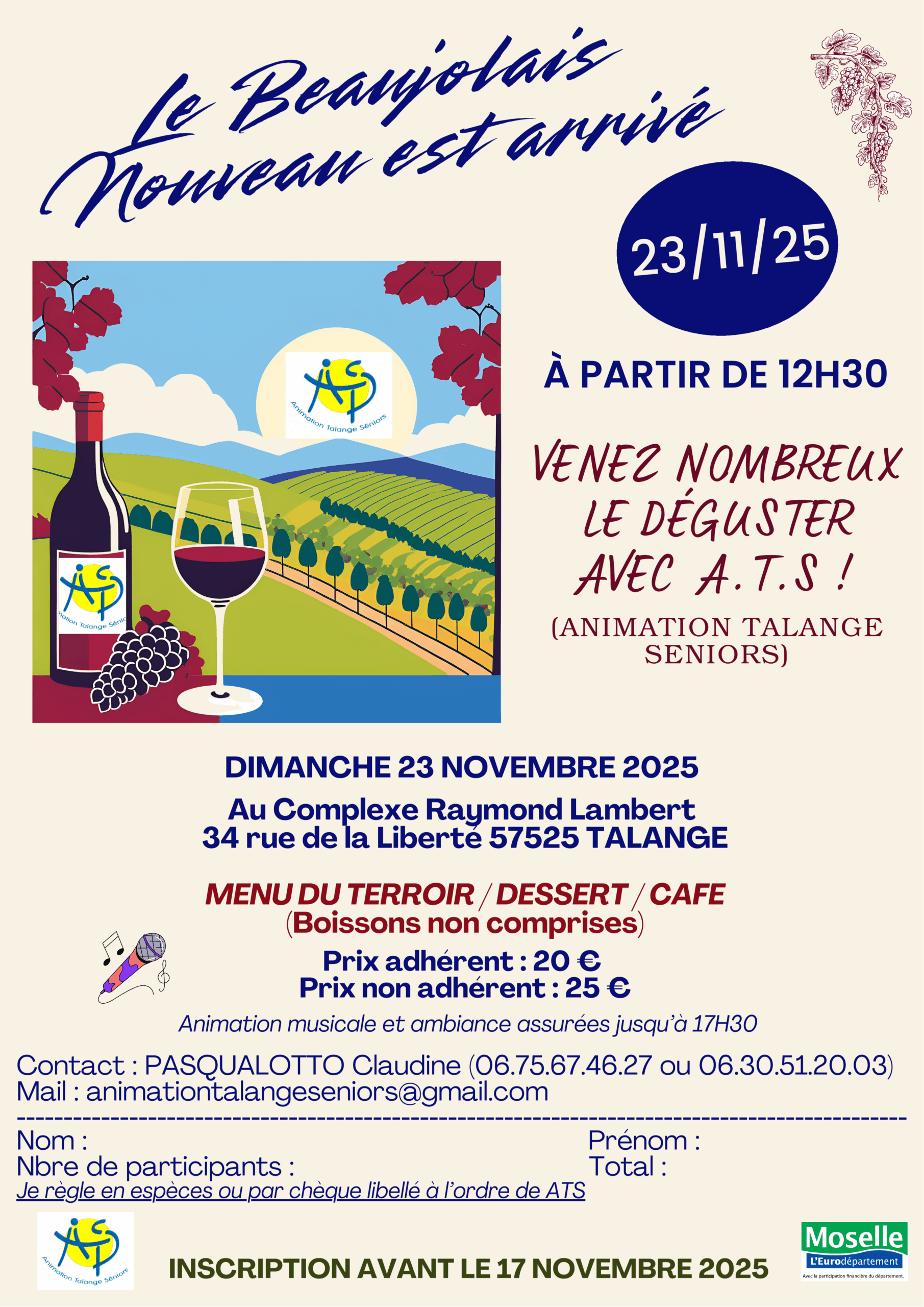 L'Association Animation Talange Seniors vous propose de déguster le Beaujolais Nouveau autour d'un repas de terroir le 23 novembre 2025, au complexe Raymond Lambert, 34 rue de la Liberté à Talange . Inscriptions par mail à : animationtalangeseniors@gmail.com ou par téléphone au 06 30 51 20 03.